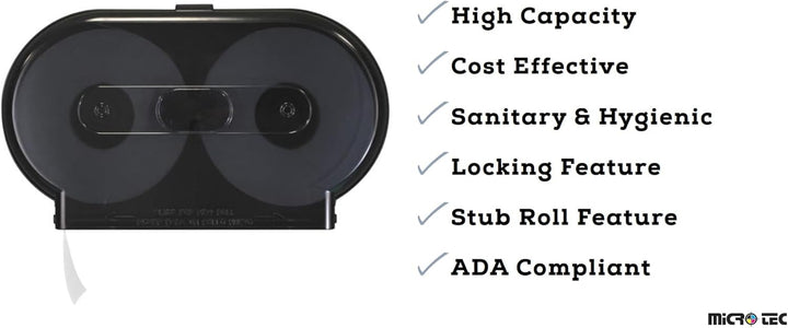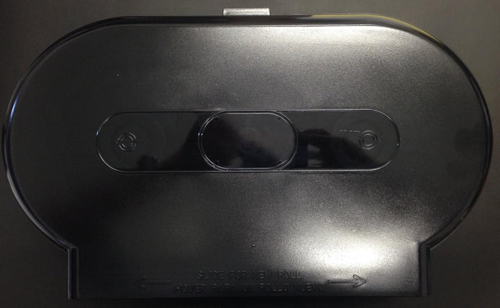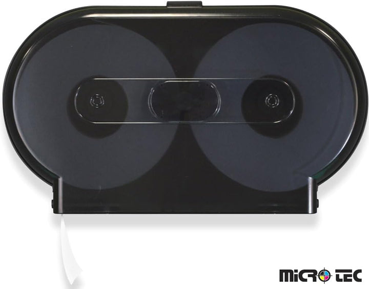 Jumbo Roll Twin JR Toilet Paper Dispenser – Commercial Bath Tissue Holder for 2 Rolls – Fits Up to 9" Diameter Rolls – Translucent Smoke Cover & Black Base – Modern Key Lock Design for Secure Restroom Supply