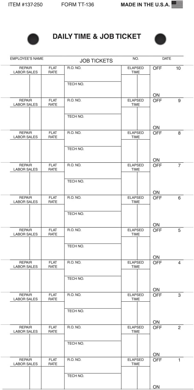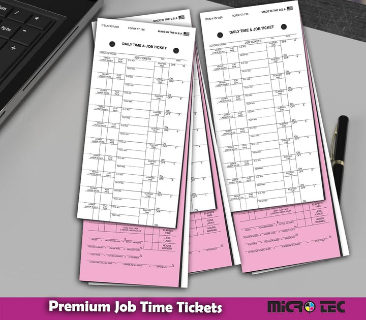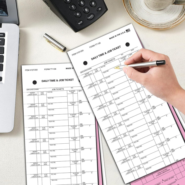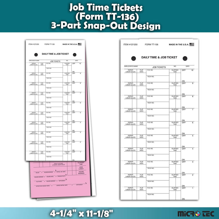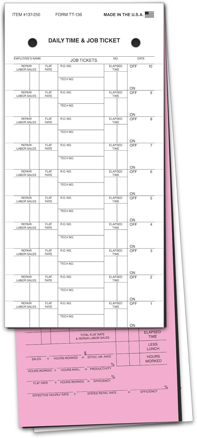 Premium Job Time Tickets for Mechanic Tracking (Form TT-136) – Carbon Interleaved 3-Part Snap-Out Design – 4-1/4" × 11-1/8" Adhesive Time Cards – Pink & White Tags – Black Ink Printing for Auto Repair Shops