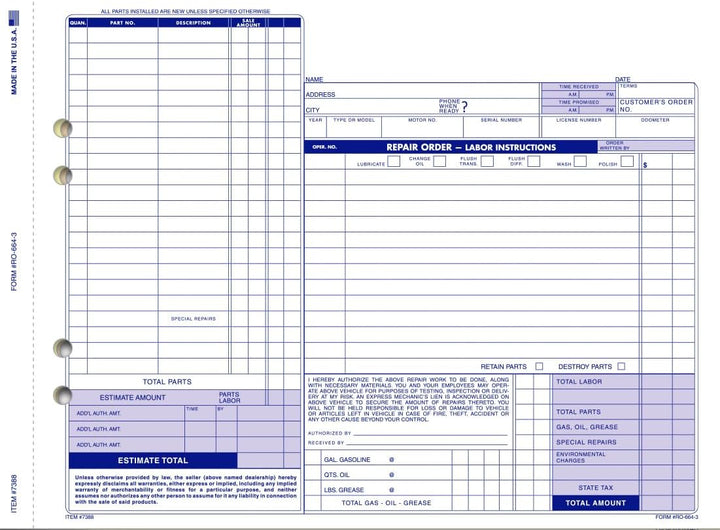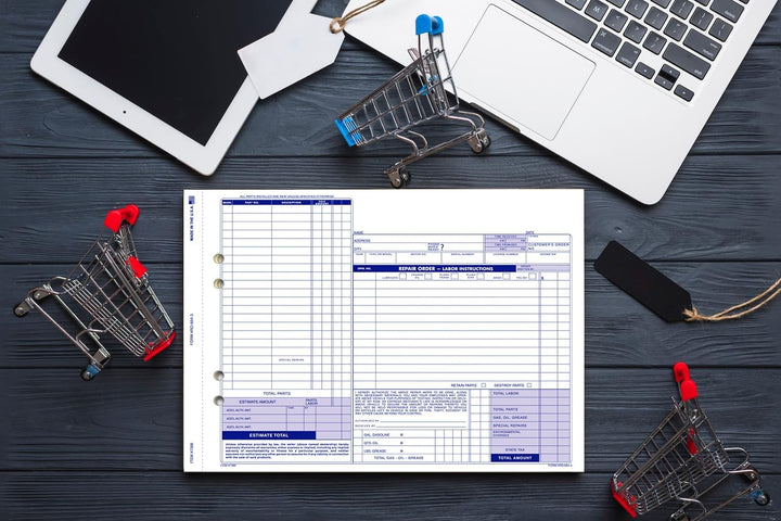 Repair Orders for Automotive Repair Shops, Garages, and Service Centers - 7-5/8" × 8-1/2" 3-Part Snap-Out Forms - Carbonless White, Canary, and Buff Tag