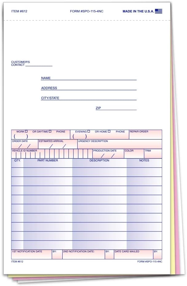 Special Parts Order Forms (SPO-115-4NC) – 4-Part Carbonless Snap-Out Auto Parts Order Forms with Customer Message Section & Postcard Mailer – 5-2/3" × 9-1/4" Multi-Colored Copies – Bulk Pack of 100